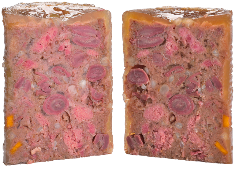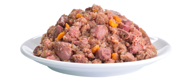 Composition: poulet 48 %, dinde 28 %, bouillon 11 %, patates douces 4,5 %, pommes 2 %, minéraux 2 %, sarrasin 1,3 %, mélange de plantes (romarin, thym, souci, pissenlit) 1 %, huile de saumon 1 %, persil 0,5 %, graines de lin 0,5 %, algues et cassis 0,2 %.