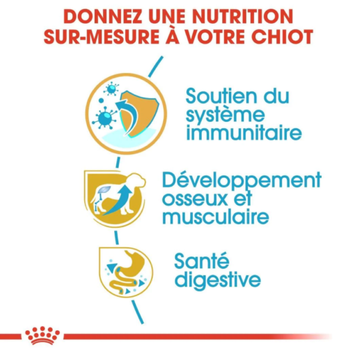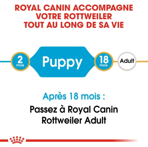 ROYAL CANIN® Rottweiler Puppy est spécialement formulé pour répondre à tous les besoins nutritionnels de votre jeune Rottweiler et convient aux chiots de moins de 18 mois. Parce que le système immunitaire de votre chiot est encore immature, ROYAL CANIN® Rottweiler Puppy contient un complexe breveté d’antioxydants, dont de la vitamine E. Cette formule exclusive aide à renforcer les défenses naturelles de votre chiot au cours de cette phase clé de sa vie. ROYAL CANIN® Rottweiler Puppy contient de la L-Carnitine et une teneur adaptée en protéines, ainsi que des taux soigneusement dosés de calcium et de phosphore, des nutriments qui favorisent le développement sain des muscles et des os de votre chiot. De plus, la formule ROYAL CANIN® Rottweiler Puppy est enrichie en nutriments spécifiques, notamment en protéines de haute qualité (L.I.P.) et en prébiotiques (FOS) pour une santé digestive optimale. Les croquettes de ROYAL CANIN® Rottweiler Puppy sont conçues sur mesure pour la race des Rottweilers. Leur taille et leur forme sont spécialement adaptées à la forme de la mâchoire de votre chiot pour lui faciliter la prise alimentaire et la mastication.