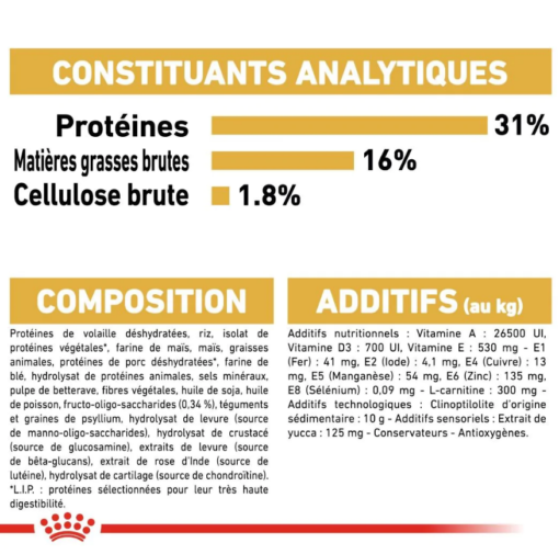 Composition : Protéines de volaille déshydratées, riz, isolat de protéines végétales*, farine de maïs, maïs, graisses animales, protéines de porc déshydratées*, farine de blé, hydrolysat de protéines animales, sels minéraux, pulpe de betterave, fibres végétales, huile de soja, huile de poisson, fructo-oligosaccharides (0,34%), téguments et graines de psyllium, hydrolysat de levure (source de mannan-oligosaccharides), hydrolysat de crustacé (source de glucosamine), extraits de levure (source de bêta-glucans), extrait de rose d’Inde (source de lutéine), hydrolysat de cartilage (sourcede chondroïtine). *L.I.P. : protéine sélectionnée pour sa très haute digestibilité.