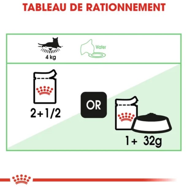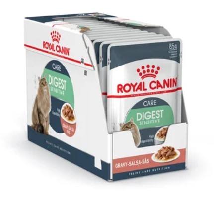 ROYAL CANIN® Digest Sensitive en sauce est conçu pour être hautement digestible par les chats qui peuvent avoir l’estomac sensible, et contient des nutriments spécialement sélectionnés qui aident à réduire l’odeur des selles de votre chat. Le taux élevé de digestibilité offert par ROYAL CANIN® Digest Sensitive en sauce assurera à votre chat une meilleure digestion des nutriments dont il a besoin et sa faible teneur en matières grasses peut également contribuer au maintien d’un poids idéal et sain. La teneur en protéines est optimale pour soutenir la force musculaire et osseuse tout en renforçant le bon fonctionnement du ventre sensible de votre chat. De plus, grâce à cette alimentation, lorsque votre chat fait ses besoins, l’odeur ne sera pas trop forte, ce qui est un signe de bonne santé digestive. ROYAL CANIN® Digest Sensitive en sauce contient également une concentration optimale et réduite en minéraux qui favorise une bonne fonction urinaire. Pour répondre aux préférences de chaque chat, ROYAL CANIN® Digest Sensitive est également disponible sous forme de croquettes savoureuses et croquantes. Si vous envisagez une alimentation mixte, il vous suffit de suivre nos instructions pour vous assurer que votre chat reçoit la quantité de nourriture sèche et humide nécessaire pour un bénéfice optimal.