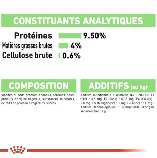 Constituants analytiques : Protéine : 9,5 % – Teneur en matières grasses : 4 % – Cendres brutes : 1,7 % – Cellulose brute : 0,6 % – Humidité : 80,5 %.