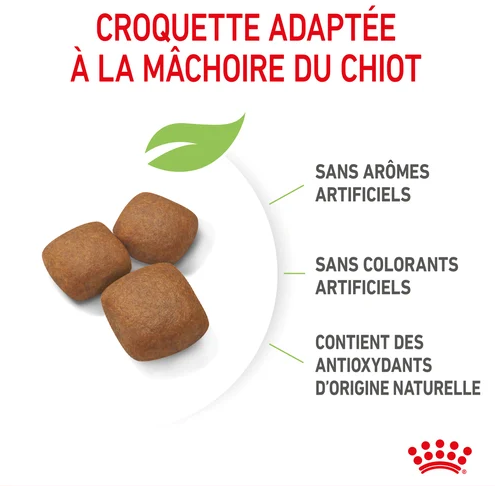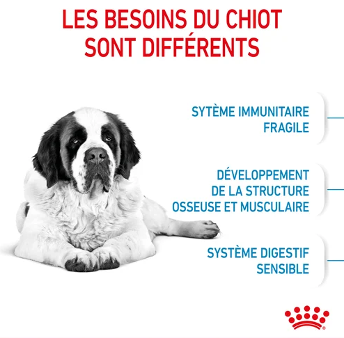 Les croquettes ROYAL CANIN® Giant Junior contiennent une teneur en protéines adaptée pour contribuer au bon développement musculaire des chiots juniors de races géantes âgés de 8 à 18/24 mois. Les chiots de races géantes ont un système digestif sensible et peuvent être sujets à la diarrhée et aux flatulences. Grâce à une combinaison de prébiotiques bénéfiques (tels que les FOS et les MOS) et de protéines hautement digestibles, l’aliment sec ROYAL CANIN® Giant Junior soutient le développement du microbiote intestinal de votre chiot et favorise son équilibre pour lui assurer une bonne santé digestive. Les croquettes ROYAL CANIN® Giant Junior sont enrichies en nutriments tels que la vitamine C et E pour aider les chiots à soutenir leurs défenses naturelles et favoriser le bon développement de leur système immunitaire encore immature. De plus, cette formule contient une teneur précise en minéraux, notamment en calcium et en phosphore, pour favoriser le développement d’os robustes et sains. La taille et la forme des croquettes ROYAL CANIN® Giant Junior ont également été conçues pour ralentir la vitesse d’ingestion. Cette caractéristique est importante, car les chiens de races géantes doivent manger lentement pour réduire le risque de torsion gastrique. Lorsque votre chien junior de race géante atteint l’âge de 18/24 mois, il a besoin d’une alimentation spécialement adaptée pour répondre à ses besoins nutritionnels de chien adulte. À ce stade, vous pouvez commencer la transition vers l’aliment ROYAL CANIN® Giant Adult, disponible sous forme de croquettes. Tous les aliments secs de notre gamme croissance contiennent des antioxydants d’origine naturelle, et sont formulés sans colorants ni arômes artificiels.