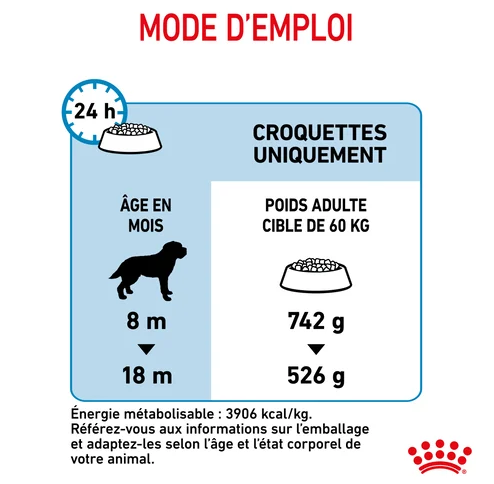 Une teneur équilibrée en énergie et une teneur précise en minéraux, dont du calcium et du phosphore pour favoriser le développement d’os robustes chez les chiens de grandes races.