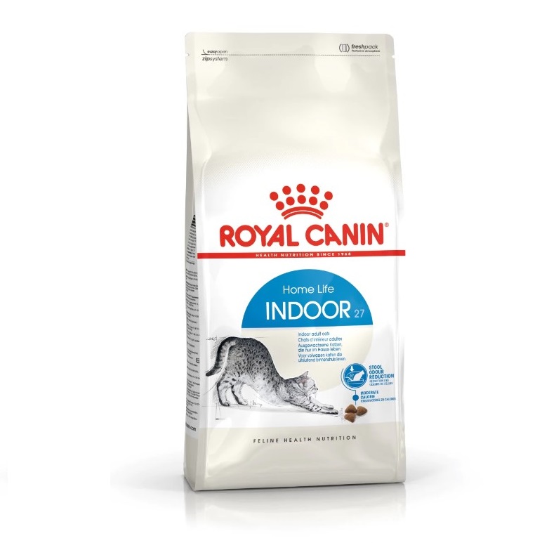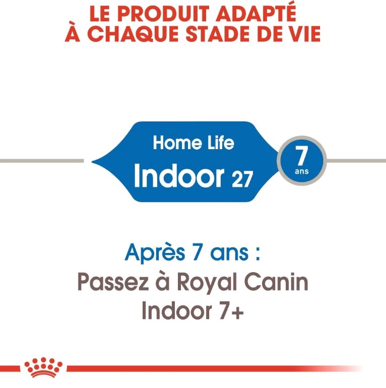 Les chats d’intérieur adultes comme le vôtre ont tendance à faire moins d’exercice que les chats d’extérieur, c’est pourquoi il est important qu’ils reçoivent une alimentation équilibrée et complète contenant des nutriments bénéfiques favorisant une santé optimale. ROYAL CANIN® Indoor 27 contient des protéines hautement digestibles (L.I.P.) spécifiquement sélectionnées pour leur très haute digestibilité. Elles contribuent également à réduire la quantité des selles de votre chat, ainsi que l’odeur qu’elles peuvent produire lorsque les chats ont un transit intestinal moins efficace en raison du manque d’exercice. La teneur modérée de cet aliment en matières grasses garantit que l’apport calorique de votre chat est adapté à son niveau d’activité, cet apport calorique contribuant également à maintenir son poids de forme. Il est courant que les chats d’intérieur passent de longs moments faire leur toilette. Grâce à l’ajout de fibres alimentaires spécifiques, comme le psyllium, cet aliment favorise également l’élimination des poils ingérés, réduisant ainsi considérablement la formation de boules de poils. La gamme ROYAL CANIN® Indoor est également disponible en fonction du mode de vie, de la morphologie et de l’âge de votre chat : Indoor Long Hair et Indoor 7+. Pour répondre aux préférences individuelles de chaque chat, ROYAL CANIN® Indoor est également disponible sous forme de morceaux en sauce, en gelée ou en mousse. Si vous envisagez une alimentation mixte, il vous suffit de suivre nos instructions pour vous assurer que votre chat reçoit la quantité de nourriture sèche et humide nécessaire pour un bénéfice optimal.