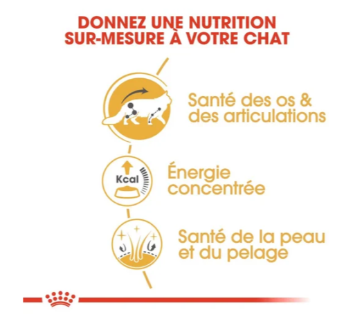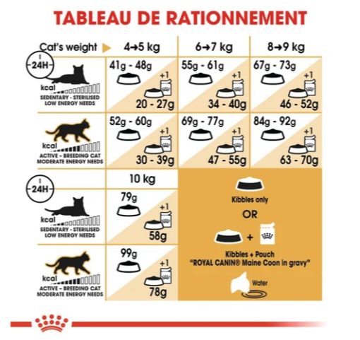 La formule ROYAL CANIN® Maine Coon Adult est spécialement conçue en fonction des besoins de cette race si particulière. Vous pouvez être certain que répondre aux besoins nutritionnels de votre Maine Coon est aussi important pour nous que pour vous. Le Maine Coon est le plus grand chat domestique au monde, et il se caractérise à la fois par sa stature imposante et sa nature très douce. Son ossature solide et son corps musculeux peuvent le rendre jusqu’à trois fois plus lourd qu’un chat moyen. En raison de sa grande taille et de sa structure osseuse, il est essentiel d’accorder une attention toute particulière à son état de santé général et à ses articulations. ROYAL CANIN® Maine Coon Adult est enrichi en taurine, en DHA et EPA (des acides gras oméga-3) pour contribuer au renforcement d’un bon fonctionnement cardiaque. La grande mâchoire du Maine Coon lui fait saisir et mâcher sa nourriture de façon bien particulière. C’est pourquoi les croquettes ROYAL CANIN® Maine Coon Adult sont assez grosses et de forme cubique, afin de favoriser une mastication prolongée ainsi qu’une bonne hygiène buccale. Pour répondre aux préférences individuelles de chaque chat, ROYAL CANIN® Maine Coon Adult est également disponible sous forme d’aliment humide en émincées en sauce. Si vous envisagez une alimentation mixte, suivez simplement nos instructions pour vous assurer que votre chat reçoit une quantité adéquate d’aliments secs et humides pour un bénéfice optimal.