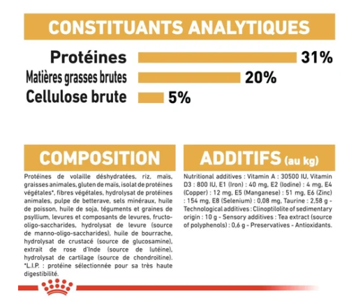 Composition : protéines de volaille déshydratées, riz, maïs, graisses animales, gluten de maïs, isolat de protéines végétales*, fibres végétales, hydrolysat de protéines animales, pulpe de betterave, sels minéraux, huile de poisson, huile de soja, téguments et graines de psyllium, levures et composants de levures, fructo-oligosaccharides, hydrolysat de levure (source de mannan-oligosaccharides), huile de bourrache, hydrolysat de crustacé (source de glucosamine), extrait de rose d’Inde (source de lutéine), hydrolysat de cartilage (source de chondroïtine). *L.I.P.: protéines sélectionnées pour leur très haute digestibilité.