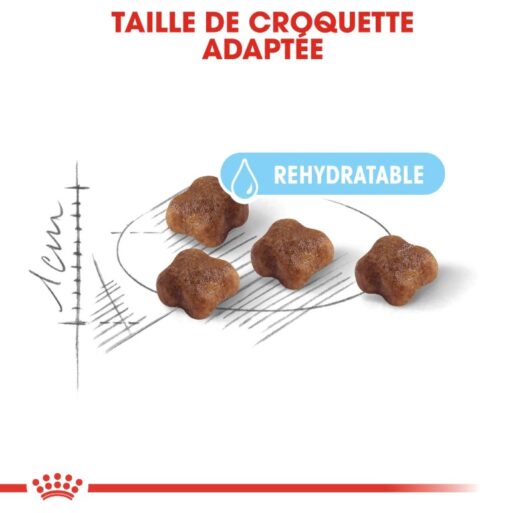 Croquette adaptée qui peut être facilement réhydratée pour faciliter la transition du lait vers l’aliment solide.