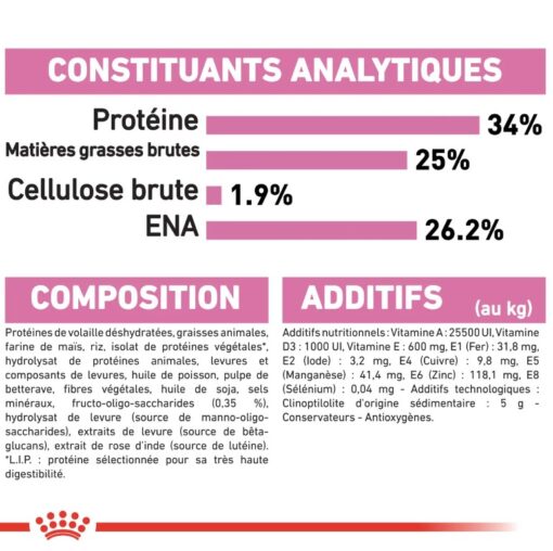 Composition : protéines de volaille déshydratées, graisses animales, farine de maïs, riz, isolat de protéines végétales*, hydrolysat de protéines animales, levures et composants de levures, huile de poisson, pulpe de betterave, fibres végétales, huile de soja, sels minéraux, fructo-oligosaccharides (0,35 %), hydrolysat de levure (source de mannan-oligosaccharides), extraits de levure (source de bêta-glucans), extrait de rose d’Inde (source de lutéine).